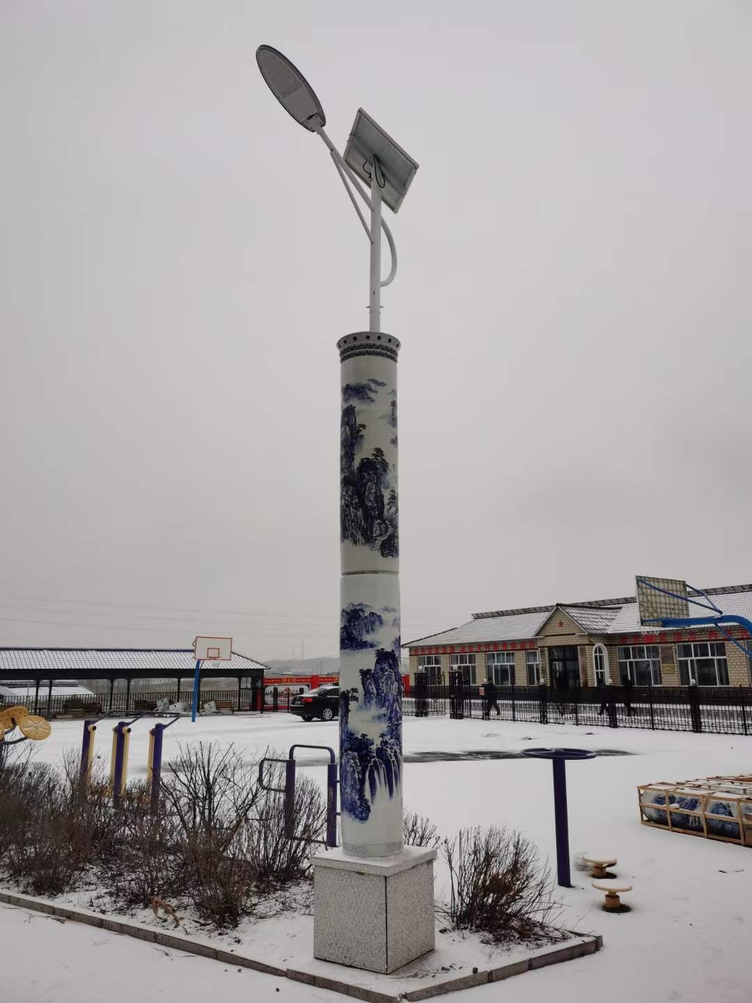 陶瓷燈柱的配置,如下:高1.9米,直徑0.45米,每根兩節,一套兩根,陶瓷燈柱畫面主要以山水畫為主,每一節下面打一個洞,寫景德鎮制,由于顧客不知道怎么安裝,所以派了專業人員去指導安裝,本次的運費也我們這邊出的。來看看產品: